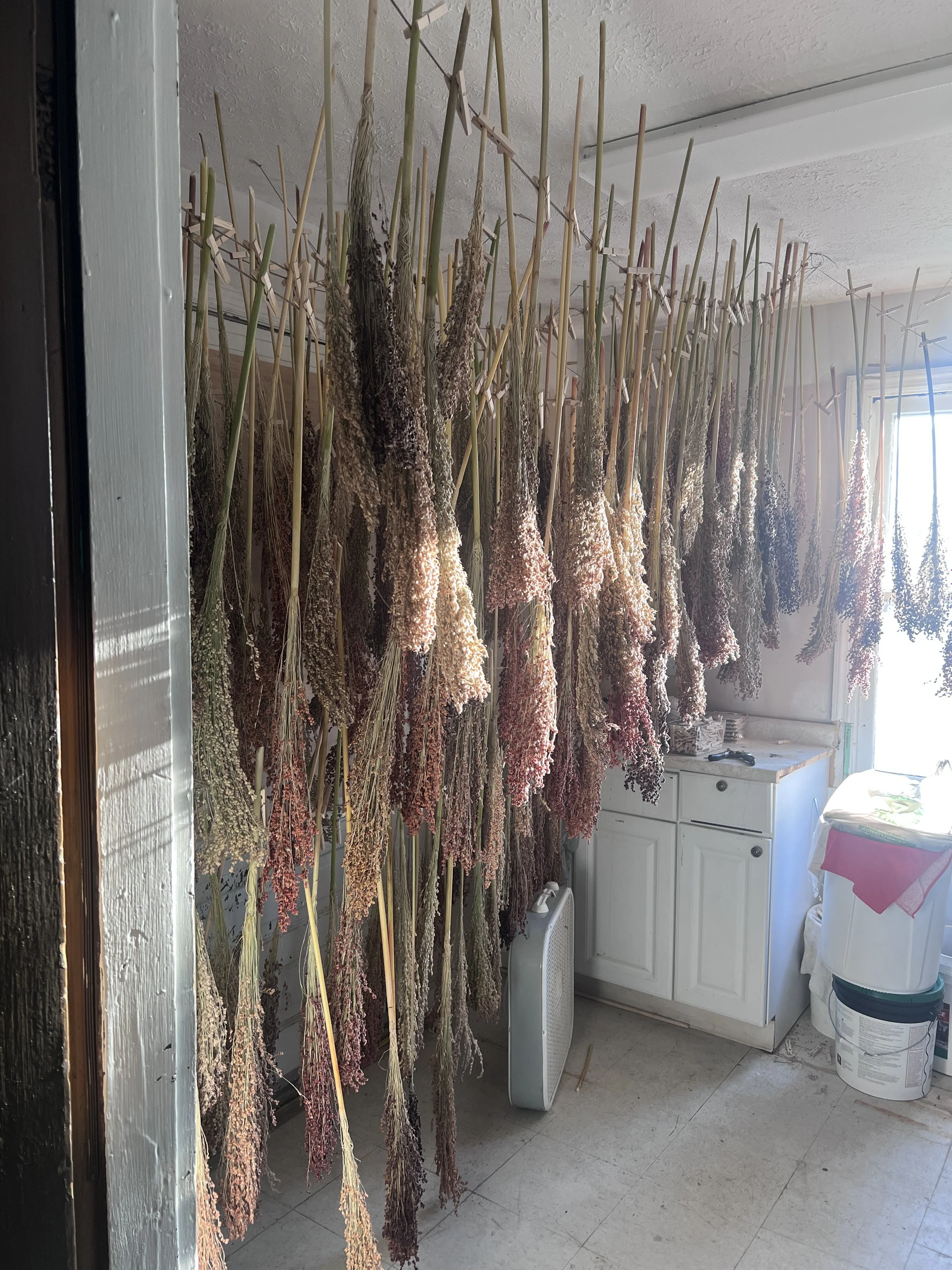 Broomcorn is washed and laid out in the sun to dry for a couple days, then it is hung inside to finish the drying process