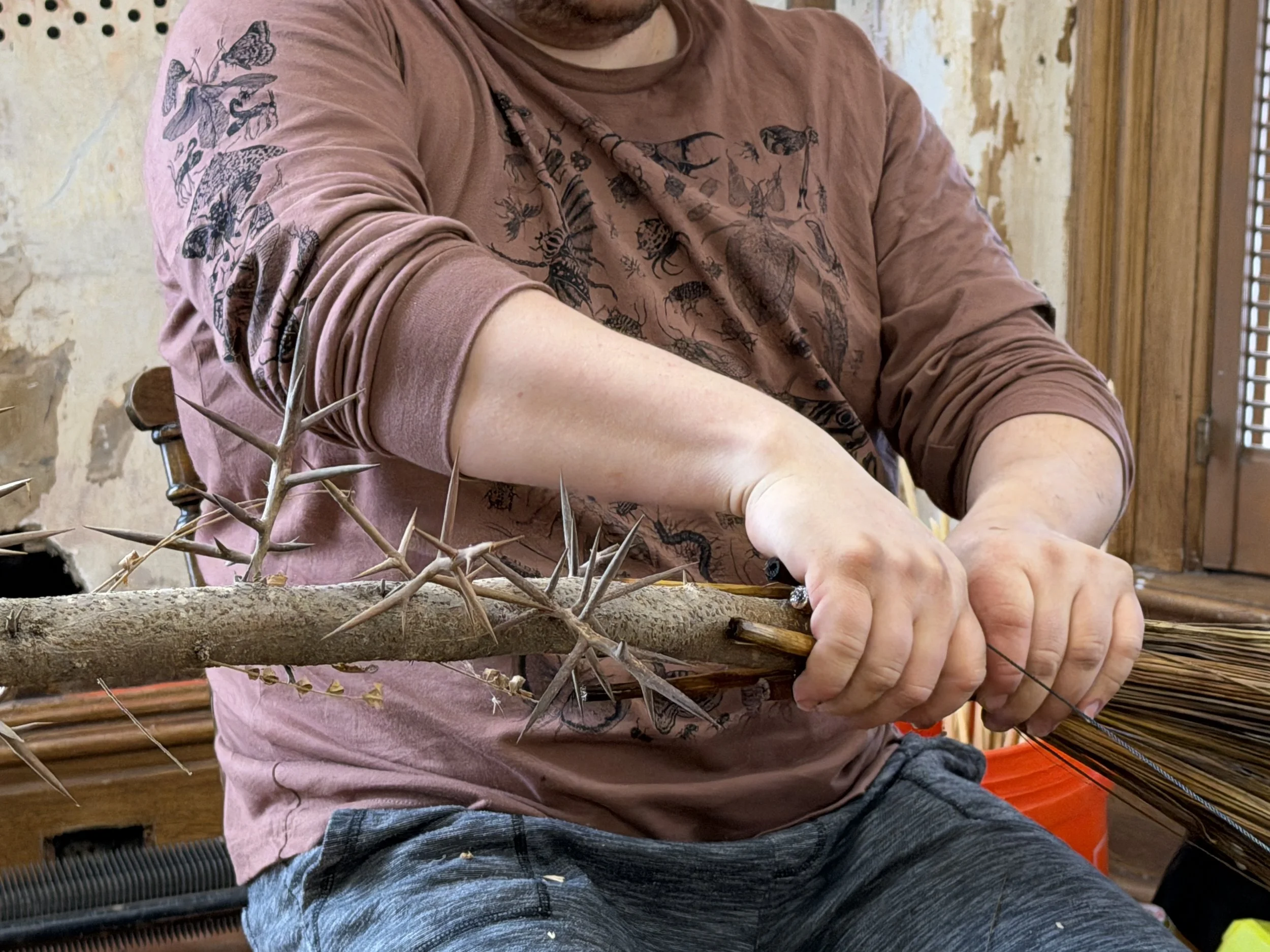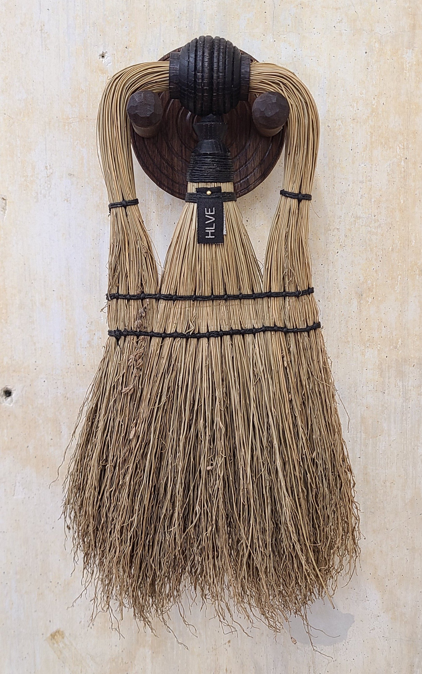 Naturally dyed broomcorn, locust branch, nylon