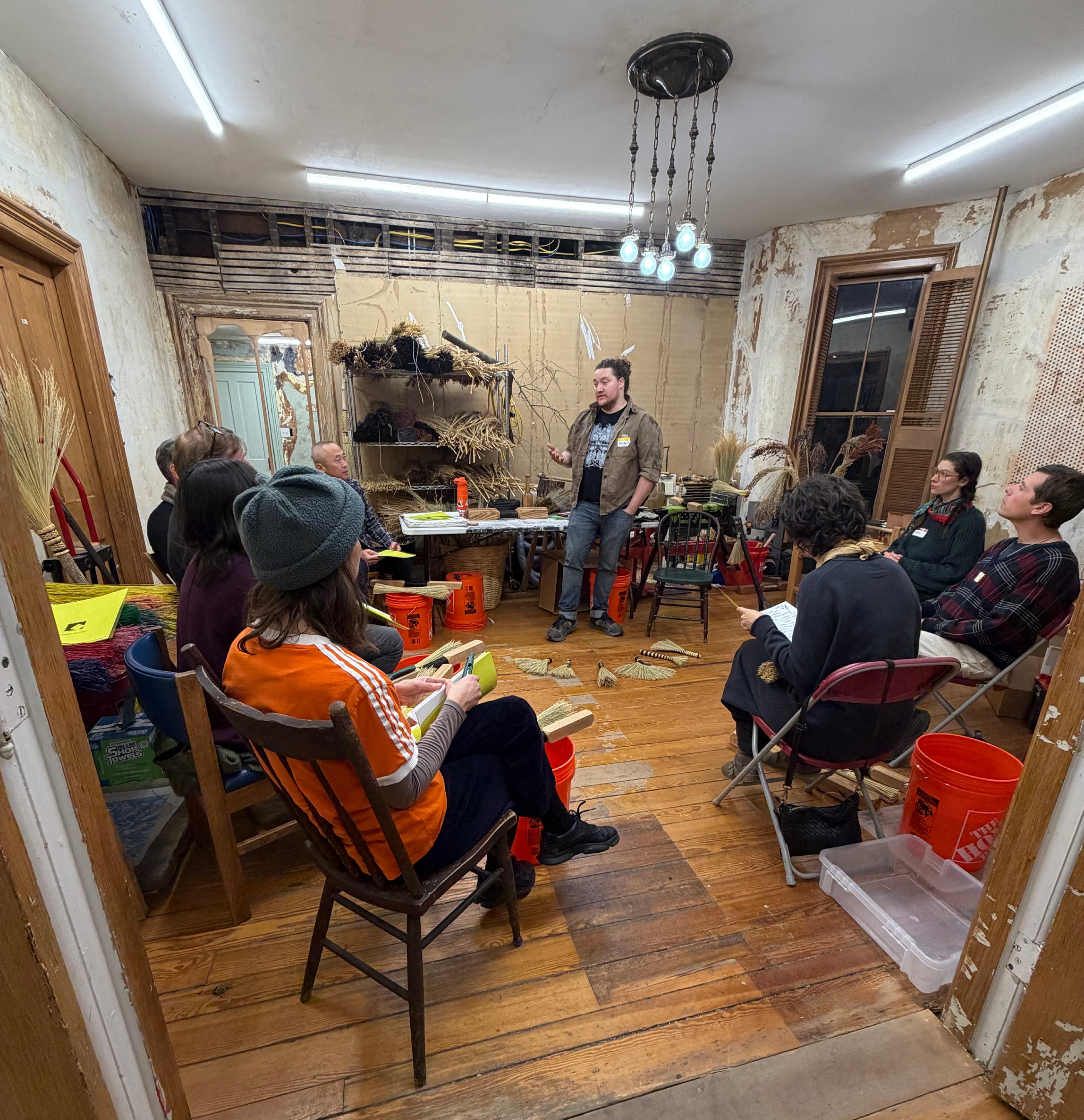 once the residency properly began, education was one of two primary focuses. over the course of 3 weeks, there were 6 classes, weekly studio hours, and a number of private demos. Interested parties came from the community as well as from out of state to visit shed and to participate in this unique experience. by the end of the residency, over 60 people had made their first broom and several hundred people had come through the doors of SHED Projects.
